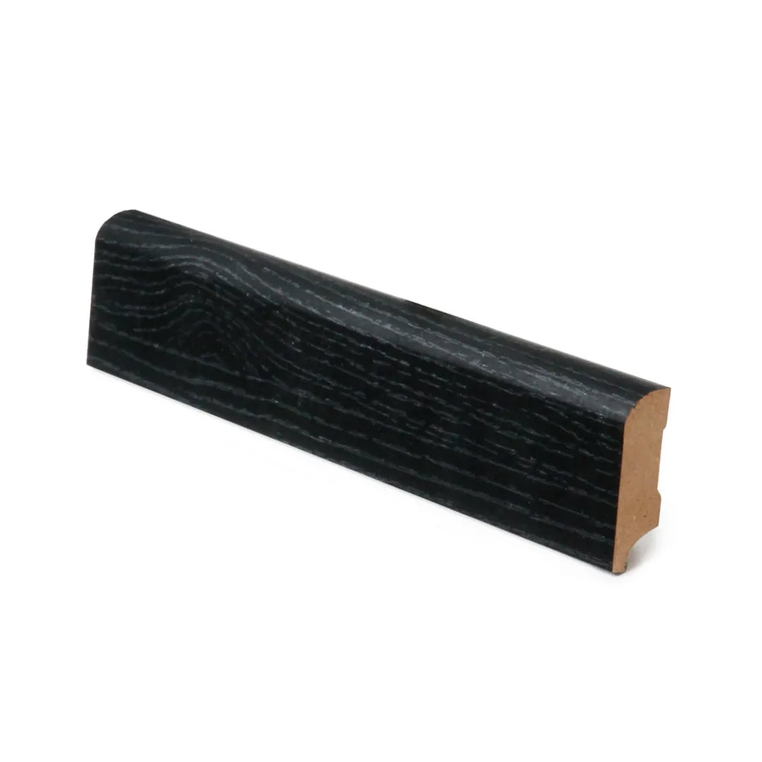 Den grafitfärgade MDF-golvlisten är belagd med slitstark melamin, vilket säkerställer en enhetlig produkt utan färgskillnader.