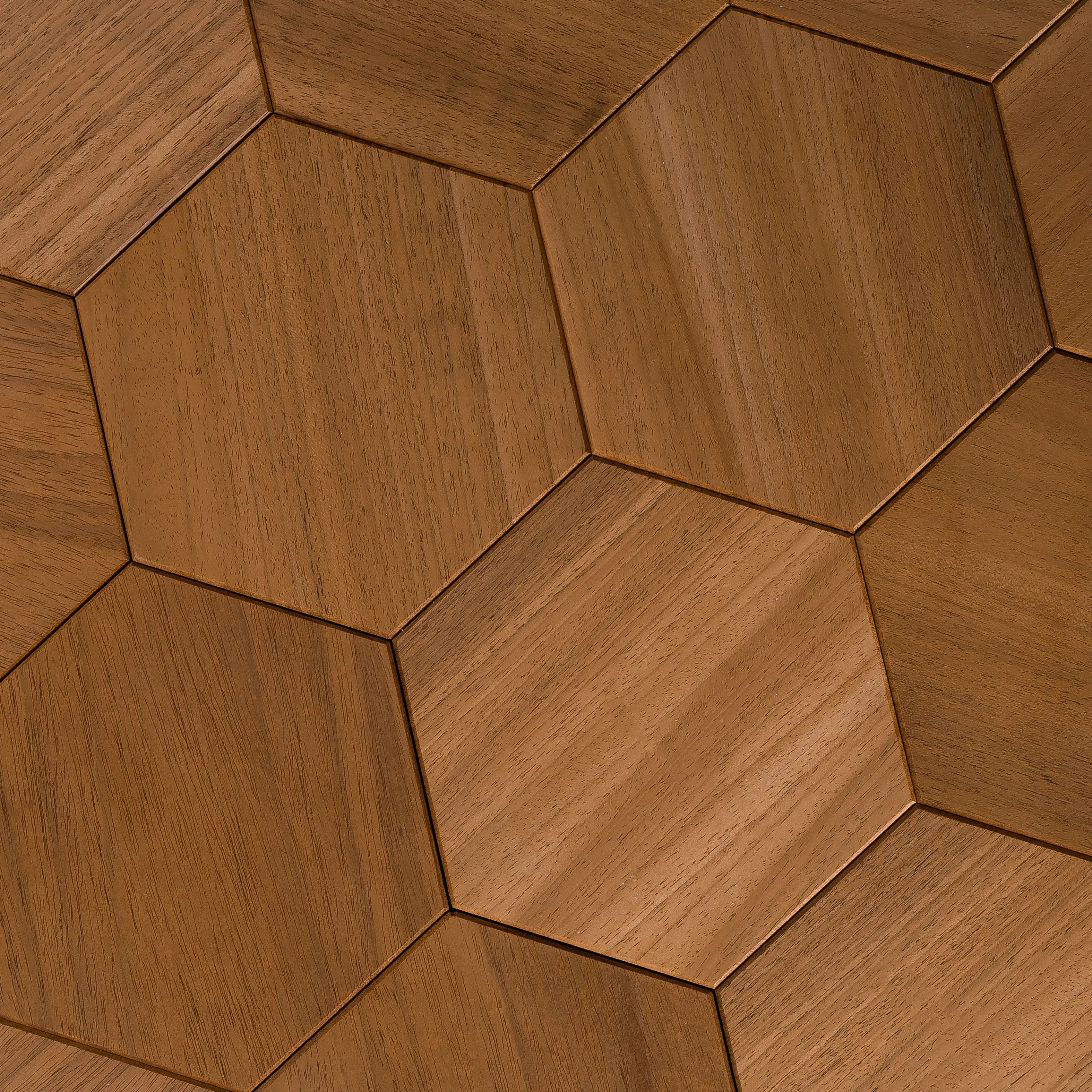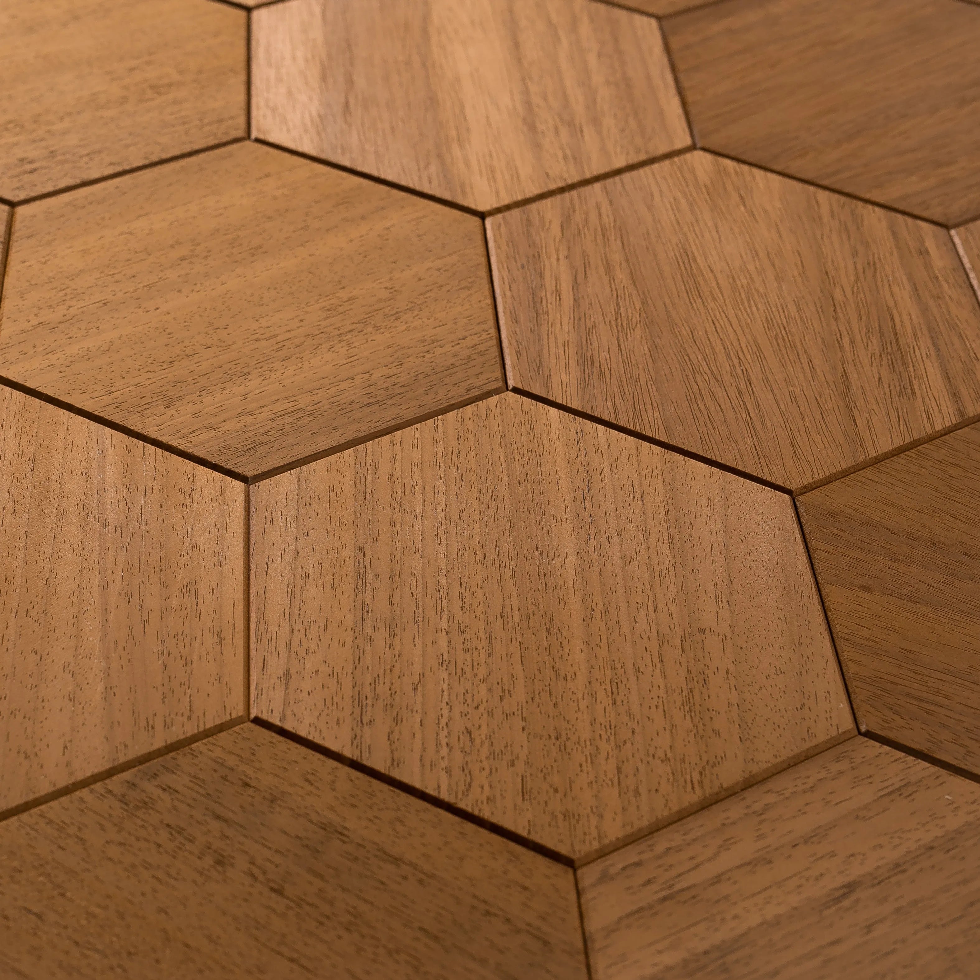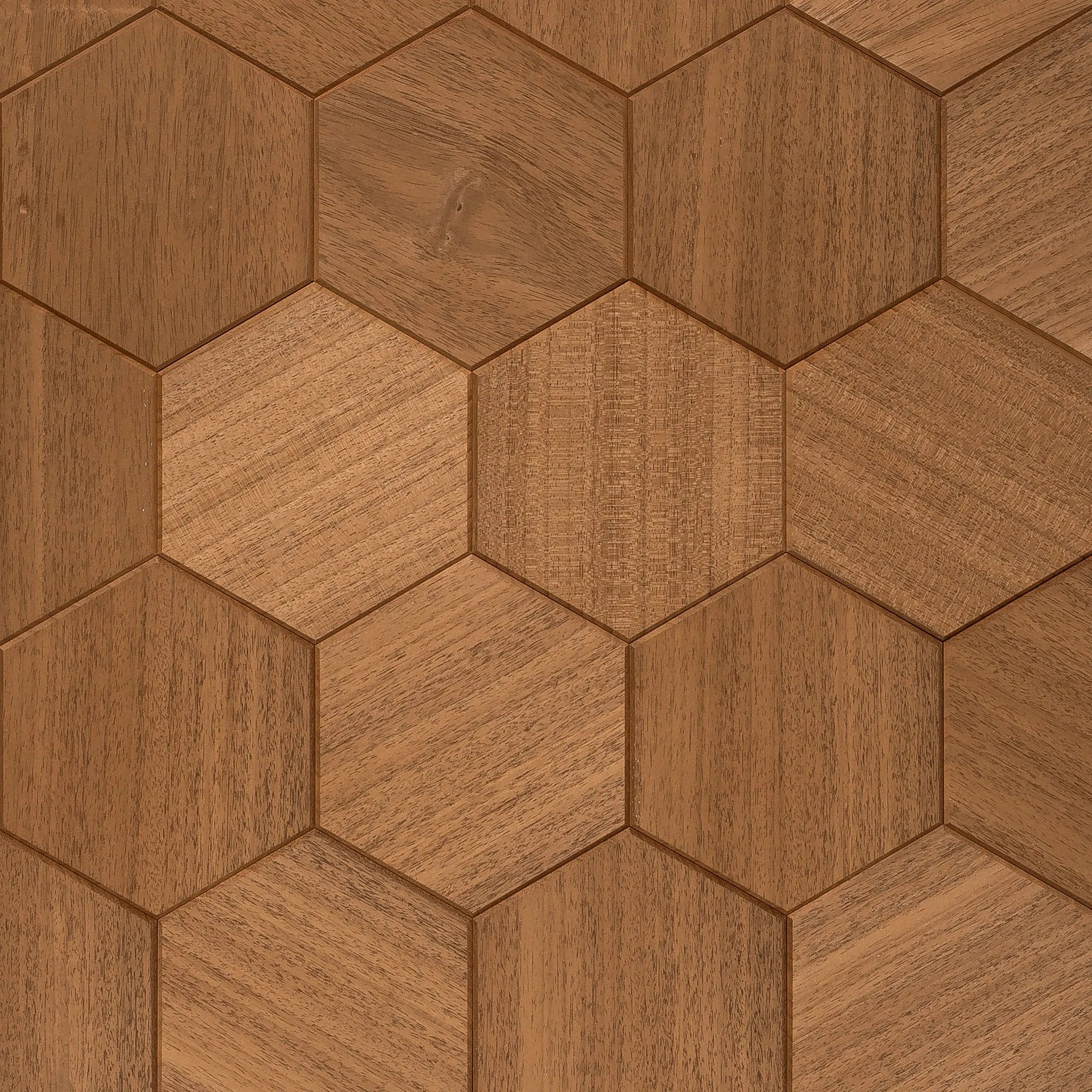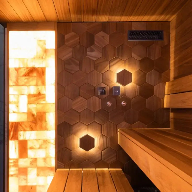 Hexa XL väggpaneler är högkvalitativa dekorativa paneler tillverkade av DecNord. De är tillverkade av premiumabachiträ och är speciellt utformade för att förbättra estetiken i bastur och andra inomhusutrymmen. Panelerna är formade som vanliga hexagoner, vilket skapar ett elegant och modernt utseende som enkelt kompletterar interiören.