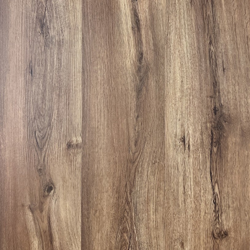 Ett vinylgolv med styv kärna för flytande installation med en toppknackande i4F not- och spontat utförande som gör installationsprocessen effektivare och enklare. Denna planka är 5,0 mm tjock och har ett 0,55 mm slitlager ovanpå. Mörkbrunt ekmönster.