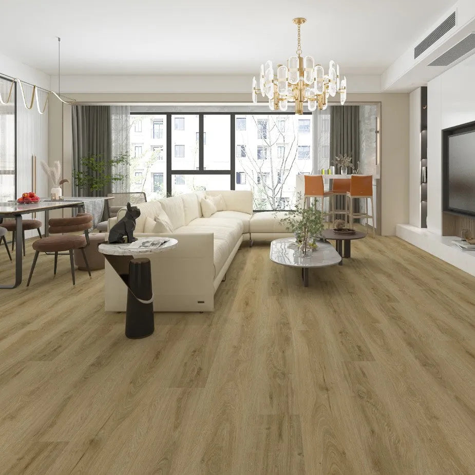Högkvalitativt och slitstarkt vinylgolv med en kärna av stenkomposit (SPC) är tillverkat av återvunnen sten och bindemedel. Detta ger det en särskilt solid och hållbar struktur. Dessutom gör SPC-strukturen golvet utmärkt ljudisolerat, vilket gör det till ett idealiskt val för utrymmen där man vill minska ljudefterklang. Detta vinylgolv erbjuder också en behaglig gångupplevelse tack vare sin integrerade stegljudsisolering.